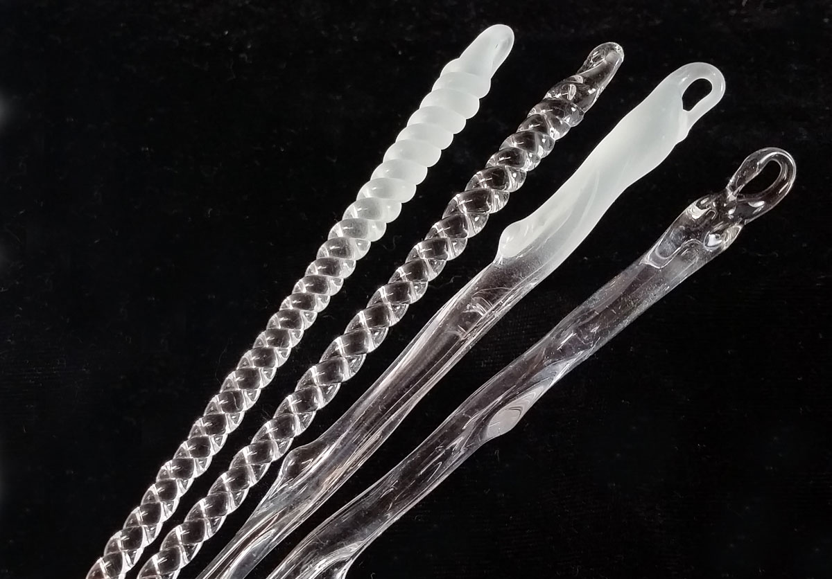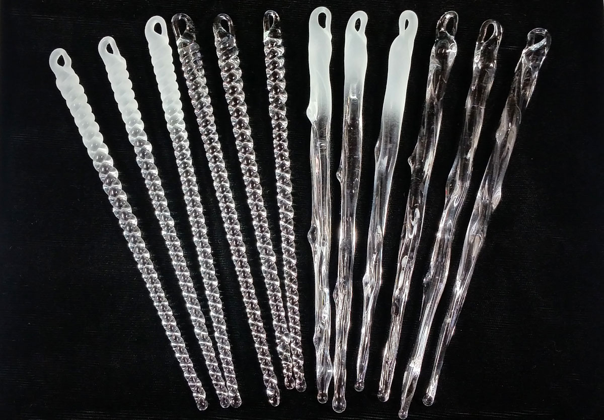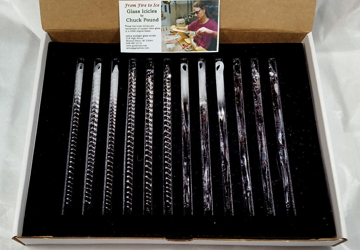 One dozen clear glass icicles handmade by Chuck Pound carefully packed in a reusable padded storage box. This is a mix of all 4 styles seen in the photo. If you would like to specify what icicle styles you receive, please do so in the order comments. These icicles sparkle brightly on a Christmas tree or in a sunny window, and they never melt! Every fold in the icicle catches and reflects light. Each glass icicle is made by hand one at a time. No two will be exactly the same and size will vary from about 5-1/2 to 7 inches. Glass icicles are a very popular item in our shop where people can hold and see their sparkle in person.