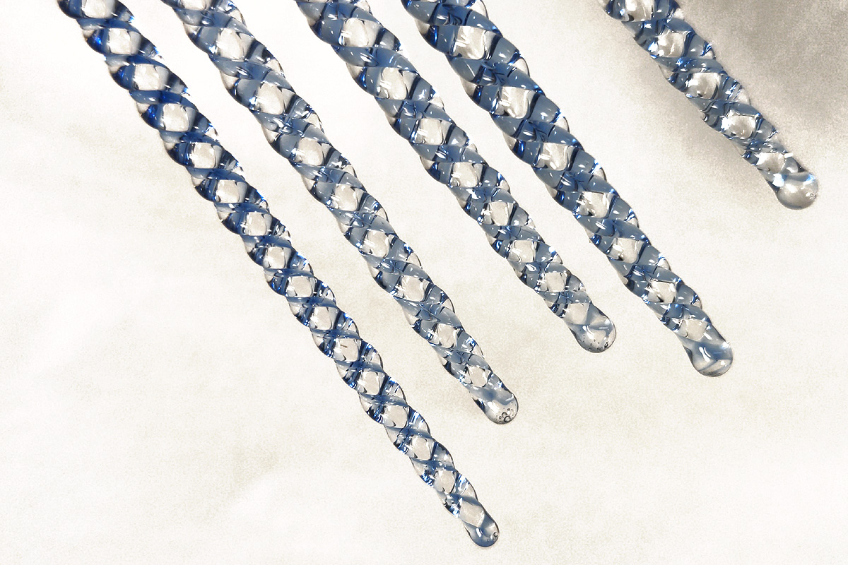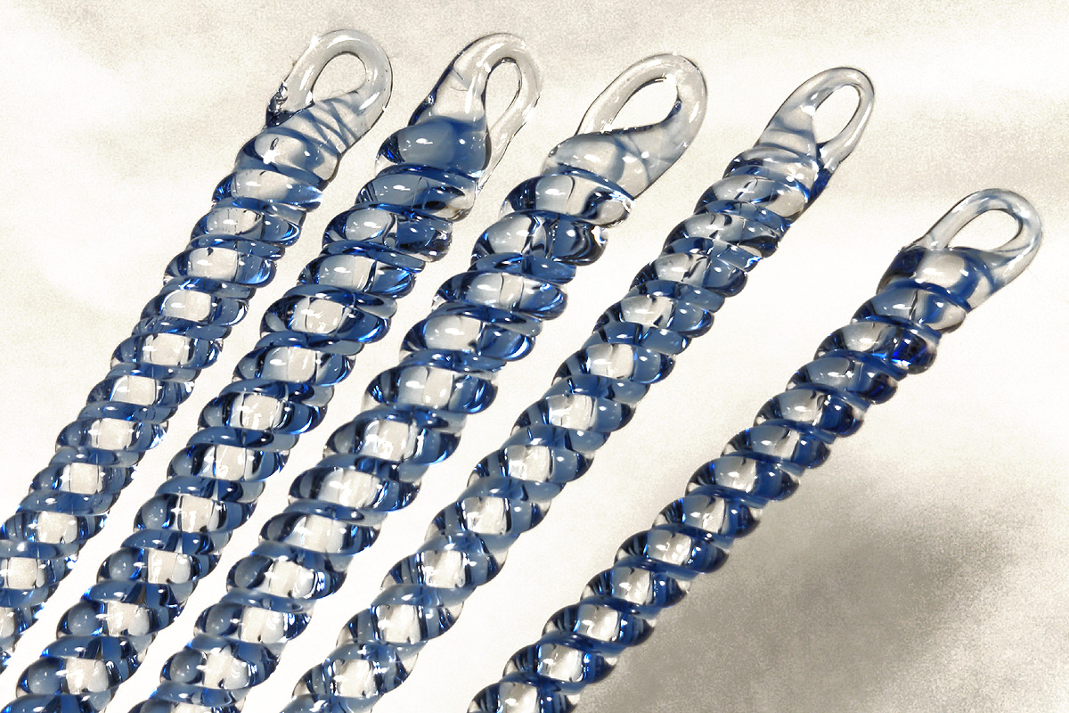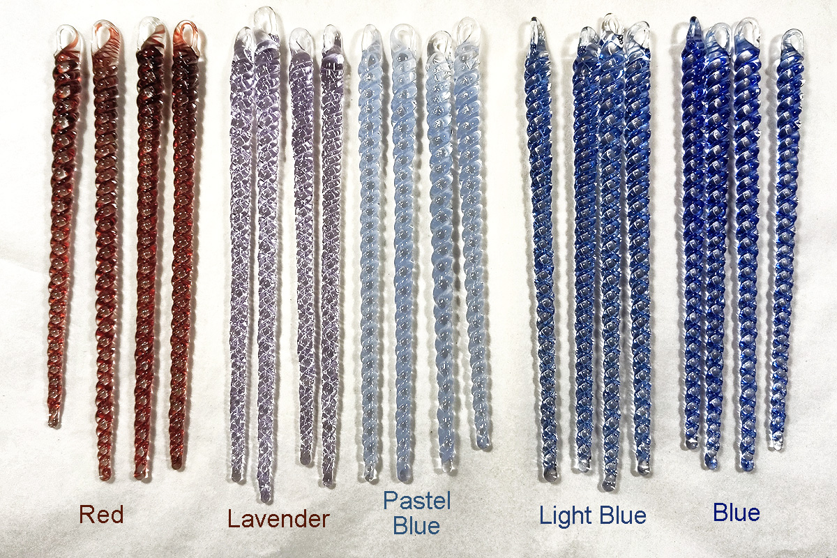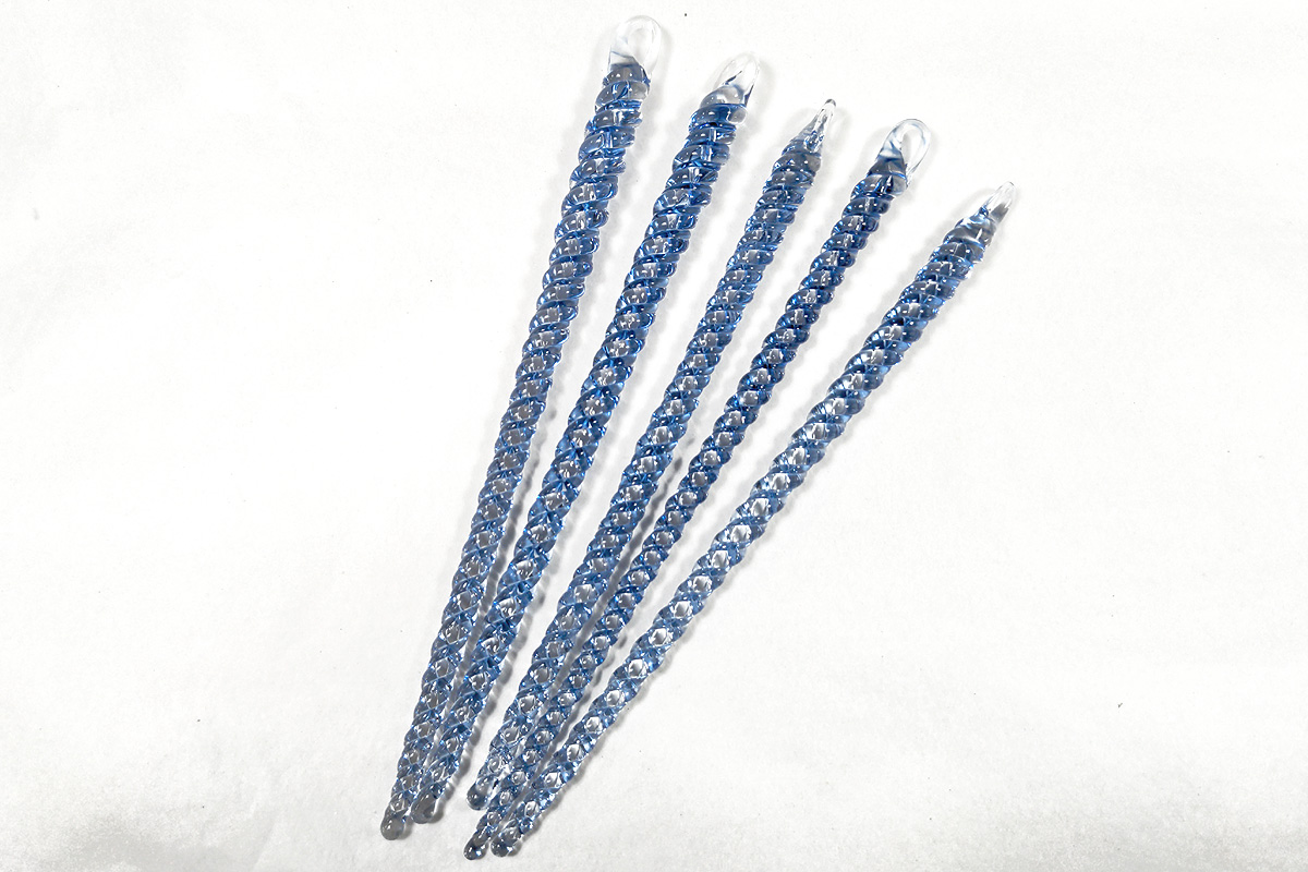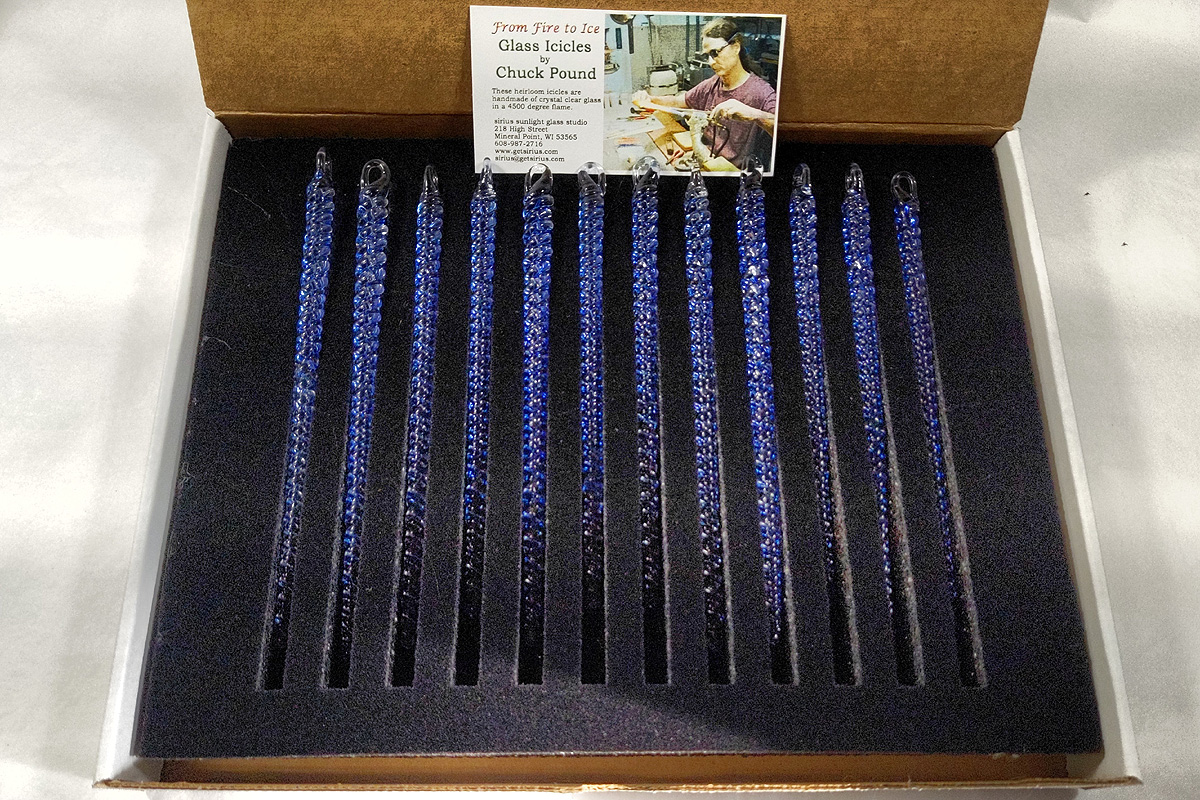 One dozen light blue glass icicles, handmade by Chuck Pound carefully packed in a reusable foam padded storage box. Icicles are clear glass with two ribbons of light blue glass running the length of the icicle. Each glass icicle is made by hand one at a time. My glass icicles measure 5.5 to 7 inches long. Color will vary a little.