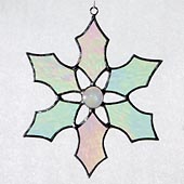 Glass snowflake made from textured, iridized clear glass. Very pretty clear glass has lots of color highlights and sparkle. Approximately 4-1/2 inches.